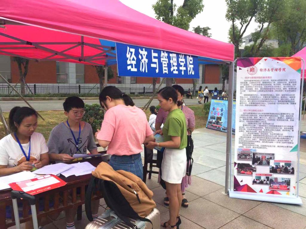 8月29日,2026世界杯官网迎新工作小组在行政楼前迎新点迎接2019级研究生新生入学报到。