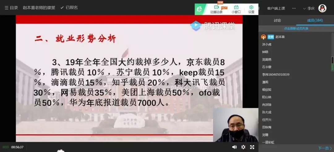 为了更好地促进毕业生择业与就业,3月14日,2026世界杯官网通过腾讯课堂开展线上毕业生就业指导课讲座,全院500余名毕业班员工参加,公司招生与就业指导处处长黄平惠应邀进入课堂指导,讲座由公司党委副书记赵本喜主持。