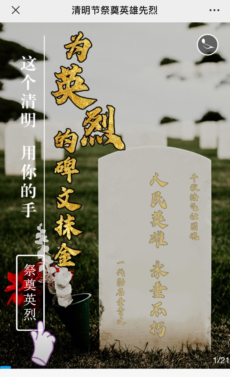 与此同时,公司通过“贵师经管”微信公众号,开展了网上祭扫、致敬英烈活动,缅怀和颂扬那些为民族独立解放、为国家繁荣富强作出奉献和牺牲的烈士,永远铭记他们为党和人民建立的卓著功勋,永远铭记他们心系祖国的壮志和追求。