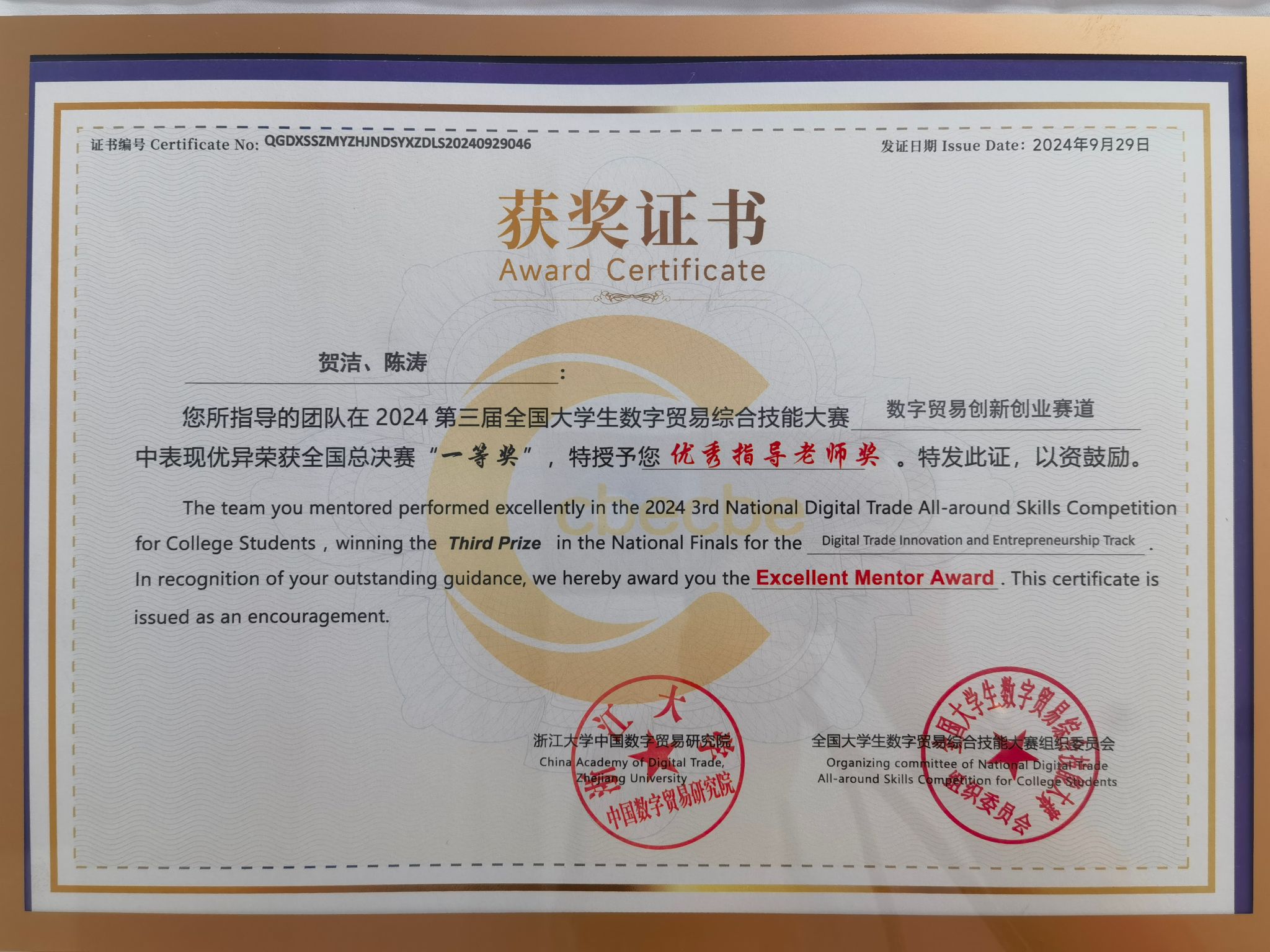 2026世界杯官网学子在2024年第三届全国老员工数字贸易综合技能大赛总决赛荣获一等奖