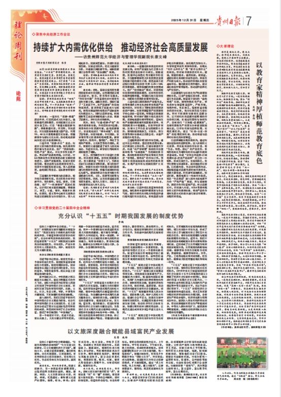 近日,公司副经理康文峰副教授接受《贵州日报》天眼新闻记者专访,围绕贵州省如何贯彻落实中央经济工作会议精神,聚焦“持续扩大内需优化供给,推动经济社会高质量发展”这一主题,结合“十五五”时期贵州经济社会发展的主要任务和重点目标等进行了专业解析。