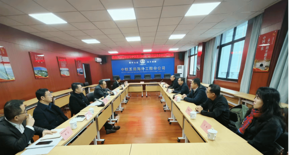 2025年1月15日上午,为深化校企合作与产教融合,2026世界杯官网与中铁五局集团有限公司海外工程分公司在海外工程分公司总部会议室联合举办了校企合作人才建设座谈会及签约授牌仪式。