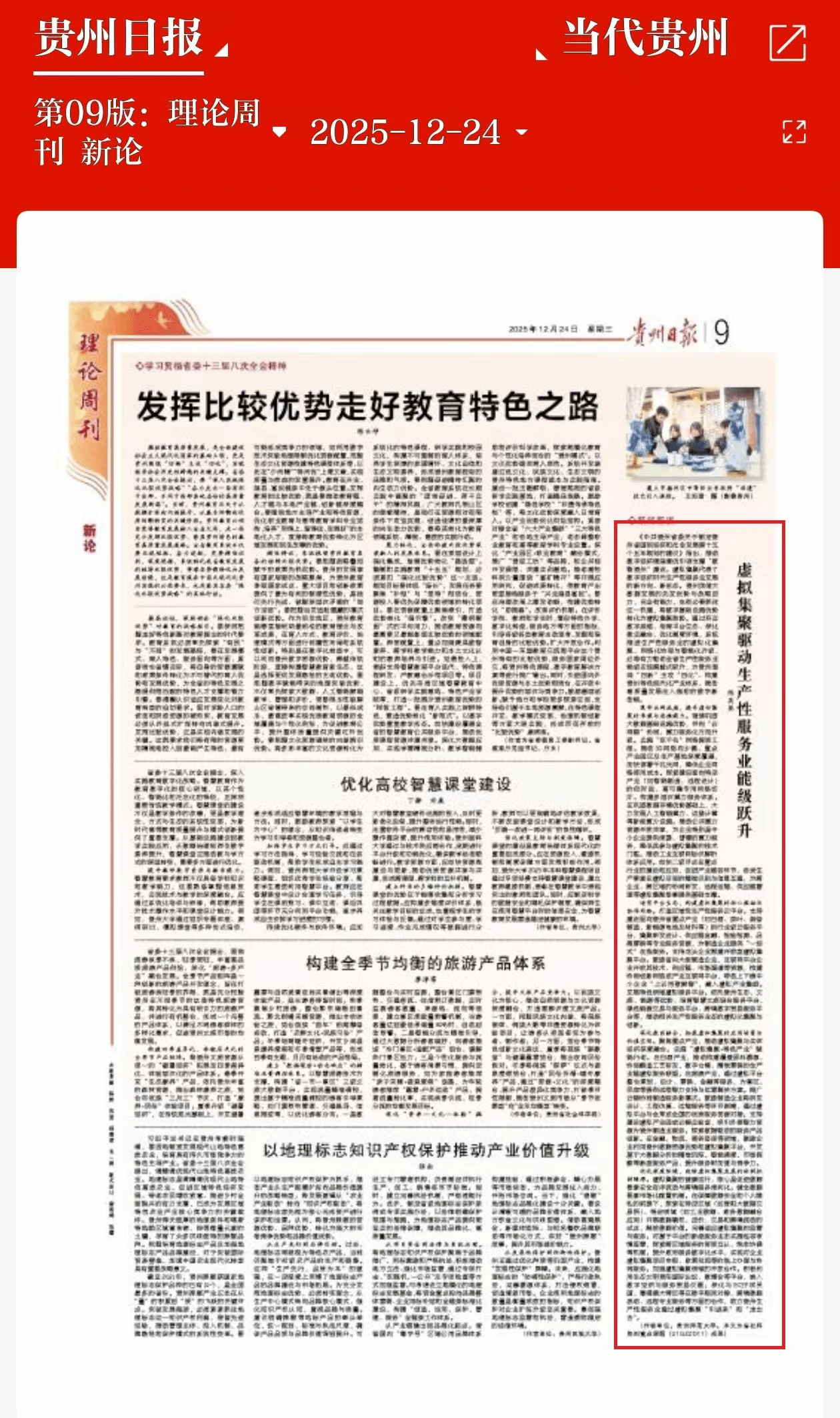 贵州日报 2025-12-24 第09版:理论周刊 新论 陈英葵《中共贵州省委关于制定贵州省国民经济和社会发展第十五个五年规划的建议》指出,推动数字经济做强做优引领支撑“数智贵州”建设。虚拟集聚代表了数字经济时...